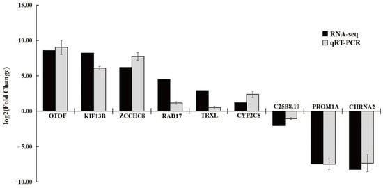 qRT-PCR validation was conducted on 9 randomly selected DEGs to inspect the reliability of RNA-Seq results, including KIF13B, CYP2C8, ZCCHC8, TRXL, RAD17, OTOF, C25B8.10, CHRNA2, and PROM1A, combined with the reference gene GAPDH, a housekeeping gene. Primer Premier 6 was employed for primer [18–27 bp in length and GC (ratio of bases guanine and cytosine to the total base): 45–55%] design, and Sangon Biotech Co., Ltd. (Shanghai, China) completed primer synthesis. Later, TIANGEN® FastKing gDNA Dispelling RT SuperMix (Tiangen Biotech, Beijing, China) was utilized to acquire cDNA through the reverse transcription of RNA. The design and synthesis of appropriate primers were also accomplished by Primer Premier 6 (Table 2) and Sangon Biotech Co., Ltd. (Shanghai, China), respectively. A LightCycler®96 real-time PCR system (Roche Diagnostics, Switzerland), together with TIANGEN® Talent qPCR PreMix (SYBR Green) (Tiangen Biotech, China), was applied to execute qRT-PCR based on the manufacturer’s protocol. The confirmation experiment was conducted using the samples from the same batch of the RNA-seq experiment. Afterward, qRT-PCR was carried out in triplicate following the protocol of 3 min of 95 °C initial denaturation, as well as 45 cycles of 95 °C for 5 s and 60 °C for 15 s. Dissociation curve analysis for the confirmation of target specificity and the 2−ΔΔCT method [] for the calculation of relative gene expression were adopted.