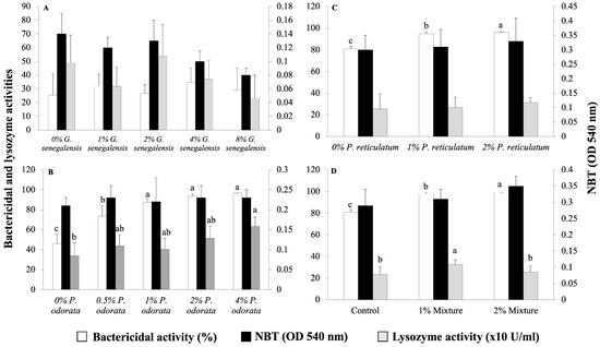 - Ngugi, C.C.; Oyoo-Okoth, E.; Mugo-Bundi, J.; Orina, P.S.; Chemoiwa, E.J.; Aloo, P.A. Effects of dietary administration of stinging nettle (Urtica dioica) on the growth performance, biochemical, hematological and immunological parameters in juvenile and adult Victoria Labeo (Labeo victorianus) challenged with Aeromonas hydrophila. Fish Shellfish Immunol. 2015, 44, 533–541. [Google Scholar] [CrossRef] [PubMed]