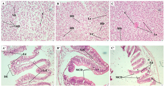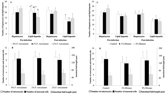 Ndour, P.M.; Fall, J.; Darias, M.J.; Caruso, D.; Canonne, M.; Pepey, E.; Hermet, S.; Fall, S.K.L.; Diouf, M.; Sarter, S. Assessing the Effects of Guiera senegalensis, Pluchea odorata, and Piliostigma reticulatum Leaf Powder Supplementation on Growth, Immune Response, Digestive Histology, and Survival of Nile Tilapia (Oreochromis niloticus Linnaeus, 1758) Juveniles before and after Aeromonas hydrophila Infection. Fishes 2024, 9, 390. https://doi.org/10.3390/fishes9100390