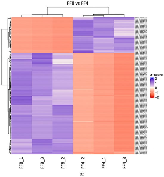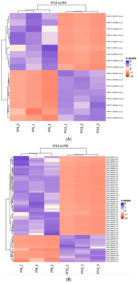 Heatmaps of the comparison of differential expression between treatments (p-value Adj less than 0.05 and a Log Fold-Change of at least 1); (A) FF12 vs. FF4; (B) FF12 vs. FF8; (C) FF8 vs. FF4. Genes up-regulated in one treatment are under-expressed in the treatment against which it is being compared.