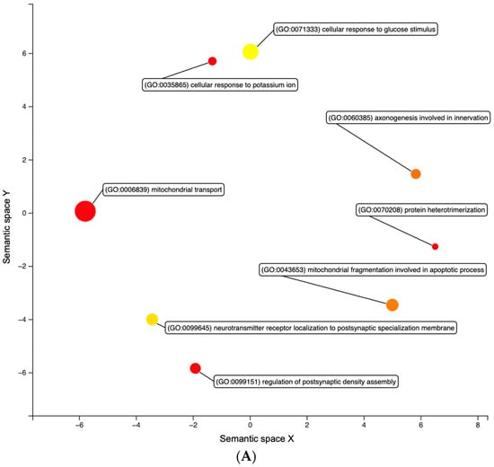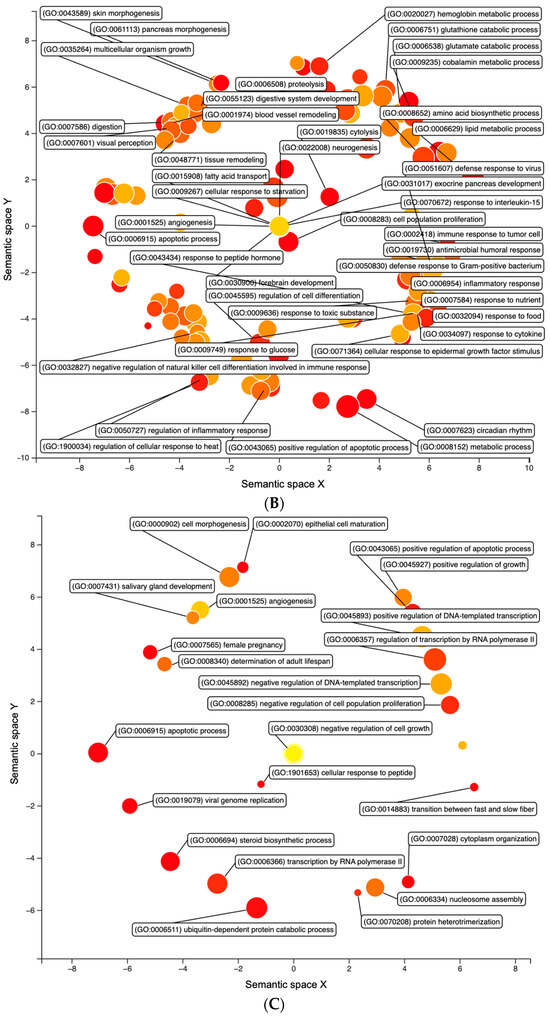 Scatterplots of the GO terms for biological processes of differentially up-regulated genes between treatments: (A) FF12 vs. FF4; (B) FF12 vs. FF8; (C) FF8 vs. FF4. The bubble color gradient (yellow to red colors) indicates the degree of GO enrichment corresponding to p-values, with the red color corresponding to the higher p-value. The bubble size is proportional to the frequency of the GO term. The spatial arrangement of bubbles approximately reflects a grouping of GO categories by semantic similarity; thus, bubbles representing similar GO terms are clustered more closely than unrelated GO terms.