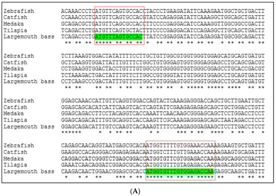 Conserved sequences of these two genes were identified by comparing available DNA sequences from the NCBI database of six fish species: largemouth bass (M. salmoides), channel catfish (Ictalurus punctatus), Nile tilapia (Oreochromis niloticus), medaka (Oryzias latipes), rainbow trout (Oncorhynchus mykiss), and zebrafish (Danio rerio). The Clustal Omega program [22] was used to align multiple vasa and nanos-2 DNA sequences (Figure 1). The Integrated DNA Technologies (IDT) OligoAnalyzerTM tool was used to design forward and reverse primers from the conserved region. The forward and reverse primers are listed in Table 2.