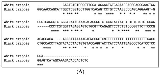 Multiple DNA sequence alignment of (A) vasa and (B) nanos-2 gene sequences from white crappie (Pomoxis annularis) and black crappie (P. nigromaculatus) using Clustal Omega program. Asterisks (*) indicate sequence conservation between two species.