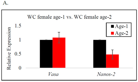 The expression levels of the vasa and nanos-2 genes were evaluated in age-2 WC females and age-2 WC males (Figure 4), and vasa and nanos-2 gene expression was found to significantly differ between the age-2 females and males. Comparing vasa gene expression, the fold change in males was upregulated by 6.4-fold compared to females, while the expression of the nanos-2 gene was upregulated by 1250-fold in males compared to females. Both genes were significantly upregulated in WC males, compared to females. These findings suggest that the sex of the WC influences the expression of the vasa and nanos-2 genes.