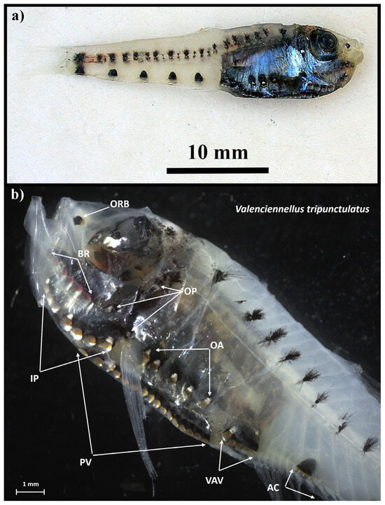Valenciennellus tripunctulatus is a rather small teleost and has a compressed, slightly elongated body, silvery anteriorly and hyaline posteriorly, having numerous melanophores [8] scattered throughout the body along the lateral line (Figure 1a). The snout is slightly shorter than the diameter of the orbits and the mouth is oblique and narrow and has teeth arranged in a single row, whereas they are absent from vomer, tongue, palatines and pterygoids [6]. The dorsal fin starts from the median portion of the body and consists of 7–10 rays, whereas the anal has 22–25 rays, the pectoral has 12–17 rays, the pelvic has 6–9 rays and the caudal has about 20 primary rays [5,6,9,10,11]. There is also a small adipose fin that is located well behind the dorsal fin [6]. Head photophores include one orbital (ORB), three opercular (OP) and six branchiostegal (BR) photophores. The ventral series (IC) has 37 to 44 photophores: IP (ventral series anterior to pectoral fin base) = 3 + 4; PV (ventral series anterior to pelvic fin base) = 15–18. The remaining photophores are arranged in the following series: OA (lateral series) = 5; VAV (ventral series between pelvic fin base and anal fin base) = 5; AC (ventral series posterior to anal fin origin) = 3 + 3+2 + 4 [6,9,10,12] (Figure 1b). The photophores begin their development at about 8 mm SL (standard length), and the first to appear are PV (ventral series anterior to pelvic fin base) and BR (on the branchiostegal membranes) [13], which are fully formed at 17 mm SL [6,12]. The presence of several photophores on the ventral margin of the body, which are used for counter-illumination, suggests the species’ adaptation to life in mesopelagic waters [14].