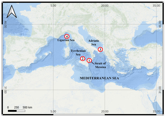 A map of the records of Valenciennellus tripunctulatus in the Mediterranean Sea: (1) [9,10,25,26,30], present paper; (2) [31]; (3) [32]; (4) [33].