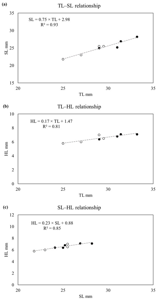 Linear relationships between (a) total length (TL) and standard length (SL); (b) total length (TL) and head length (HL); (c) standard length (SL) and head length (HL). Black dots refer to individuals measured in present paper; white dots refer to fish measurements reported by Potoschi et al. [10].