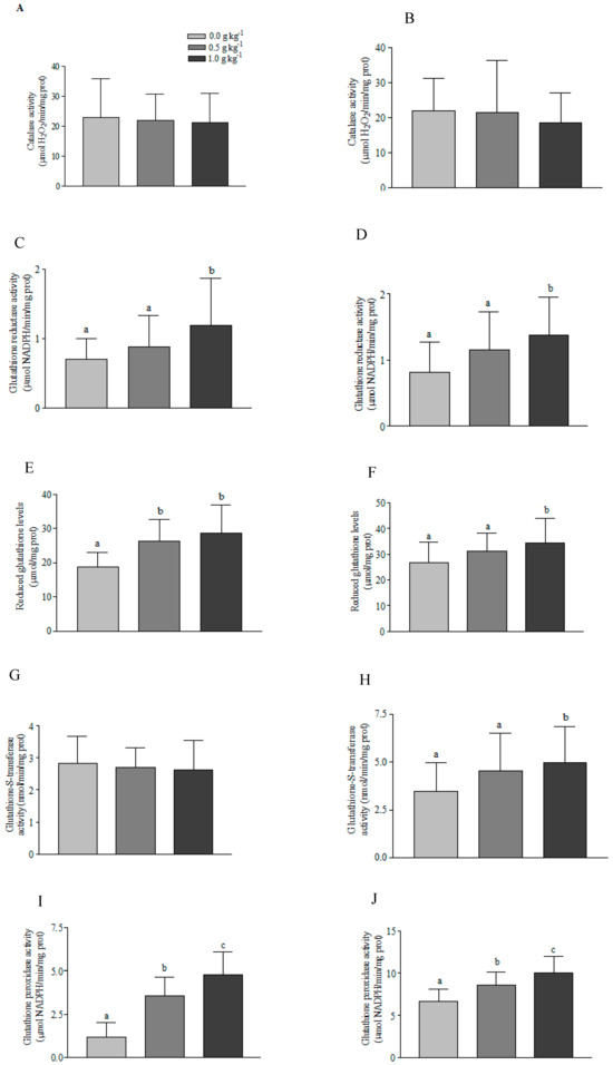 Glutathione reductase (GR) activity was determined using the methodology of Carlberg and Mannervik [35], and the results were expressed in µmol of NADPH/min/mg protein. Glutathione S-transferase (GST) activity was determined through spectrophotometry according to Habig et al. [36] and the values expressed as nmol of thioether/min/mg protein. Catalase (CAT) activity was determined according to the method described by Aebi [37] and the values expressed in µmol of H2O2/min/mg protein. Glutathione peroxidase (GPx) activity was determined by the methodology of Wendel [38], and the values were expressed as µmol of NADPH/min/mg protein. Reduced glutathione (GSH) levels were measured by the non-protein thiols method according to the methodology proposed by Sedlak and Lindsay [39] using a GSH standard curve, and the values were expressed in µM/mg protein.