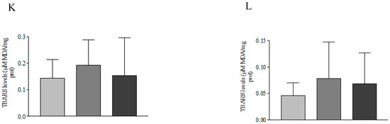 The levels of thiobarbituric acid reactive substances (lipid peroxidation—TBARS) were measured in the supernatant of hepatopancreas homogenates. For sample preparation, the medium containing an aliquot of 0.33 mg mL−1 of sample protein and 6.7% trichloroacetic acid (TCA) in a final volume of 180 μL was vortexed, left in an ice bath for five minutes, and then centrifuged for five minutes at 13,200× g at 4 °C. Afterwards, 40 μL of the supernatant was incubated with reaction medium containing butylated hydroxytoluene (BHT) 0.007 mg mL−1 in 95% ethanol, thiobarbituric acid (TBA) 3.1 mg mL−1 in 0.3% NaOH, and 7.9% TCA in PBS, in a total volume of 315 μL, for 60 min at 60 °C. After that, the material was cooled, and the pink chromophore was measured through spectrophotometry at 535 nm. The values were expressed in µM MDA mg−1 protein, from a calibration curve prepared with malondialdehyde (MDA) under the same analysis conditions [40].
