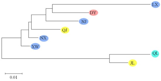 The paired Fst and Nm of the eight populations are presented in Table 4. The Fst values among these populations ranged from 0.001 to 0.109. Notably, the population pairs QJ-NX, QJ-JL, NX-QL, NX -XW, NX-DY, QL-DY, QL-JL, XW-JL, NJ-JL, and DY-JL exhibited Fst values lying between 0.051 and 0.109, exceeding the threshold of 0.05, indicative of moderate levels of genetic differentiation. Conversely, the remaining pairs displayed Fst values ranging from 0.048 to 0.001, falling within the category of slight genetic differentiation. The Nm values observed among the eight populations varied within a range of 2.3 to 217.1, consistently exceeding the threshold of 1, indicating a substantial gene flow between these populations.