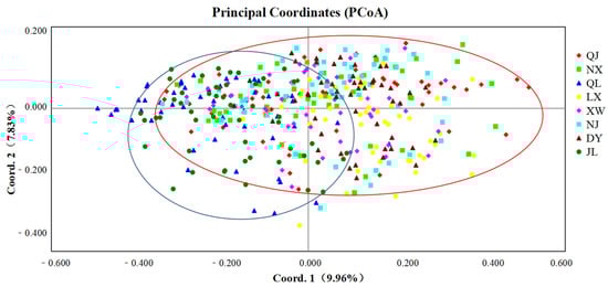 Principal coordinates analysis (PCoA) based on SSR data for P. clarkii. The blue circle refers to the JL population and the red circle refers to the QJ population. The different colors and shapes represent the different P. clarkii populations. Population abbreviations are as in Table 1, in parentheses along the X- and Y-axes. Percent variance explained by PCoA1 and PCoA2.