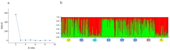 Structure analysis for eight P. clarkii breeding populations. The same color indicates populations in the same area. (a). Plot of delta K values from structure analysis; (b). bar plot from structure clustering analysis with K = 2. Population abbreviations as in Table 1.