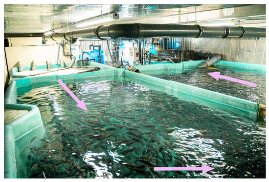 A rectangular production tank used in an inland RAS. The system is stocked with sturgeons. The arrows show the inlet and outlet for the process water treated in the water treatment at the head end of the tank. The two open flow channels are connected at the rear end. Engineering by Erwin Sander Elektroapparatebau GmbH, Uetze, Germany.
