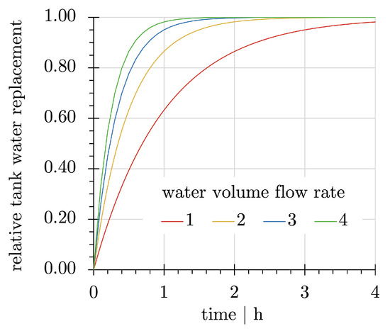 Regardless of the production tank geometry used, the water replacement rate in the production tank is a crucial parameter. The tank water replacement follows an asymptotic function [19] in the following form: , where t is the time the water is flowing [h] and is the process water volume flow rate [−1] into the tank. is the tank volume []. [−1] expresses the relative renewal rate of the tank water (Figure 4). The relative water renewal rate increases with increasing water flow rate and is 0.63, 0.86, 0.95, 0.98 for water flow rates of 1, 2, 3, 4 times the production tank volume per hour.