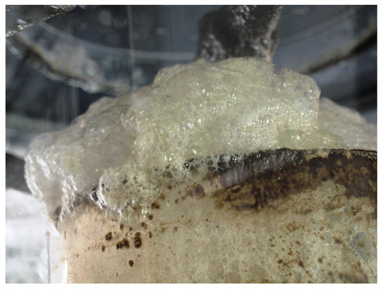 Flotation apparatuses in marine RASs typically have the form of a bubble column installed in a side stream (30% of the main water volume flow) downstream to the screen filtration. The geometry is cylindrical. In the lower part of the flotation apparatus, the foam is developing in the liquid phase in the reactor vessel. The foam ascends into the foam zone above the water level and enters into the cylindrical foam collector tube. The foam leaves the flotation apparatus at the upper edge of the foam collector (Figure 5), as well as air and residual ozone. Here, the organic substance (surfactants) is removed with particles including bacteria [34] and other microorganisms (Figure 5).