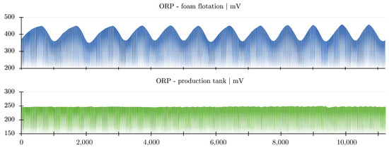 Ozone is typically supplied into the foam flotation together with an air stream, often by means of a Venturi injector. The control of ozone feed rate is usually controlled by a two-point ORP (Oxidation Reduction Potential) controller. ORP is a proxy variable for the concentration of ozone [38] and TRO. The lower ORP set-point of the controller determines the minimum of the control curve. The maximum of the control curve is determined by the upper ORP set-point and the switch-off delay of the ozone feed (Figure 6, upper graph, ORP—foam flotation). The delay is caused by the residual volume of ozone in the supply lines. The ozone flow rate needs to be thoroughly adjusted to minimize the overshoot of ORP. The control curve in (Figure 6, upper graph, ORP—foam flotation) shows that despite the delayed switch-off, the ORP remained within safe limits (Figure 6, lower graph). The process water leaving the flotation is mixed into the main process water flow. Due to reactions with dissolved organic substances present in the RAS process water, ozone and TRO concentrations typically decrease rapidly in the supply lines to the production tanks.