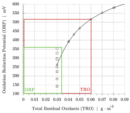 The relationship between the concentration of total residual oxidants (TRO, as ) and the Oxidation Reduction Potential (ORP) in artificial marine living systems redrawn with data from [33]. The rectangular markers show measurements of OPR in various systems: Open markers show ORP values measured in aquaria displays having a comparably low biomass density and moderate species diversity. Gray markers represents measurements in aquaculture systems having a high biomass density and low species diversity.