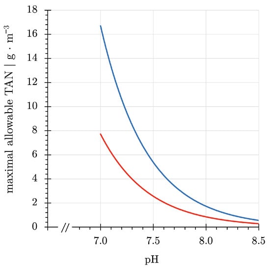 The maximum allowable TAN at different process water pH calculated for an ammonia concentration of 0.04 [59]. The equilibrium concentrations were calculated for a salinity of 18 psu and temperature of 15 (blue) and 25 (red).