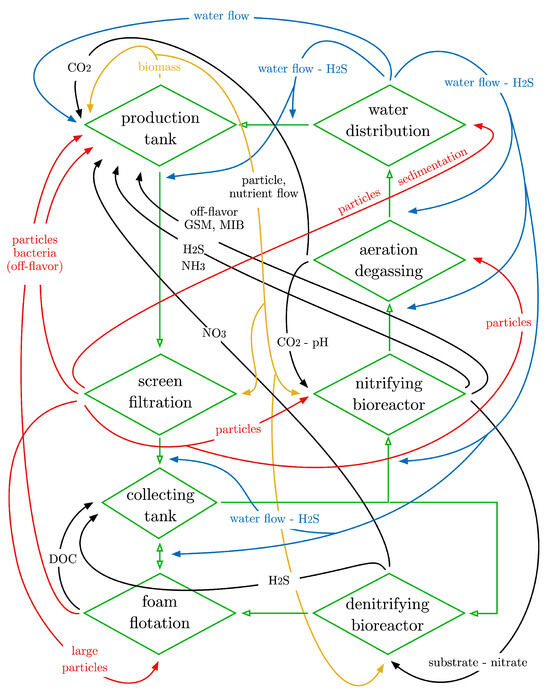 Figure 1 shows a general flow chart for a marine RAS that was successfully used by the author in experimental and commercial RAS. Care was taken to combine the components in such a way that optimal interaction of the individual components within the process chain is ensured. The aim is that during operation, every component, i.e., every single process, contributes continuously and with consistent efficiency to water treatment. This allows the necessary living conditions for fish to be maintained in the long term. This is the prerequisite for achieving the production targets and thus for the economic viability of RAS. The aim is to show interactions between the processes in order to support not only the RAS engineering process but also routine operations. This requires close cooperation between biology and engineering, since no biologist can take on the role of an engineer and no engineer can take on the role of a biologist. To ensure clarity, the flow chart in Figure 1 has been reduced to the essential components and processes.