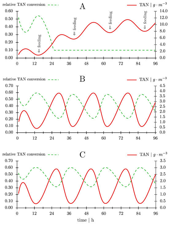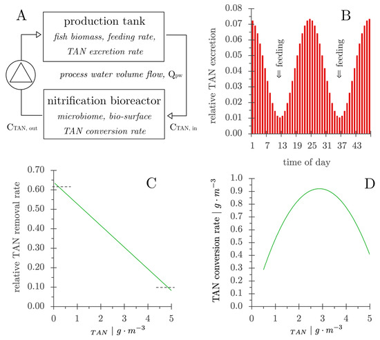 Bacterial nitrification depends on the substrate concentration. It generally follows a Monod equation with r = nitrification rate with the concentration of the substrate, e.g., TAN concentration, and = the substrate concentration at . The Monod equation shows a substrate-dependent and a substrate-independent concentration range for the nitrification rate. The half-order kinetic describes the range of substrate dependency where the nitrification rate r is increasing along with increasing TAN concentrations () [88]. Above a certain TAN concentration, the nitrification rate does not further increase. This concentration rate is described by the so-called zero-order kinetic where the nitrification rate is constant (). There are countless scientific publications with results on conversion rates in a nitrifying bioreactor. These cannot be meaningfully summarized. In each RAS, the nitrifying microbiome finds different conditions and will develop differently, and it is also based on the initial bacterial populations.