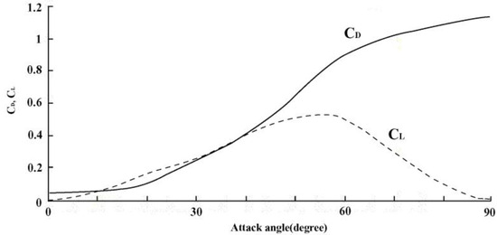 The drag and lift coefficients for a plane net in accordance with the attack angle are presented in Figure 4 [16].