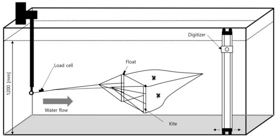 For the model experiments, a flume tank installed at the National Institute of Fisheries Science, Busan, Korea, was used. The overall dimensions of the tank were 25.12 m (W) × 4.50 m (L) × 8.27 m (H), with the observation section measuring 8.0 m (L) × 2.8 m (W) × 1.4 m (H) (Figure 6). Two experiments were conducted in July and August 2022. A 1/50 scale model of the fishing gear was installed in the center of the tank, and changes in the resistance force and shape were measured for five flow velocities ranging from 0.3 to 1.1 m/s at 0.2 m/s intervals. The measurements were taken at 0.0001 s intervals.