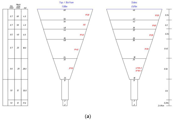 The specifications for the scaled-down version of the two net types are presented in Table 1. To quantify the resistance force generated by the fishing gear, we applied Tauti’s similarity law to create a 1/50 scale model of the Types A and B nets (Table 2 and Figure 7).
