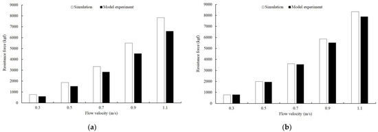 Simulation and experimental results for the resistance force of the (a) Types A and (b) B coastal stow nets.