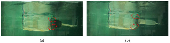 In the model experiments and simulations, net sagging was observed to occur in the areas indicated by the red circles in Figure 9 and Figure 10. This was caused by the side panels of the net being held by the bridle at the front part of the net, while the top and bottom panels of the net were pushed back. Improvements to the front part of the net are thus necessary to prevent the sagging of the net because this creates additional hydrodynamic resistance.