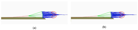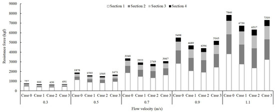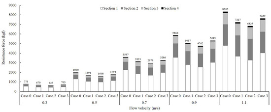 Because the model experiments could only analyze the total resistance force of the fishing gear, simulations were used to analyze the resistance force by section. For Case 0, the resistance force in Section 1 accounted for 48.7–70.6% of the total resistance force for all flow velocities in both the Type A and B nets (Figure 11 and Figure 12). These results indicate that a reduction in resistance may be possible by improving Section 1.
