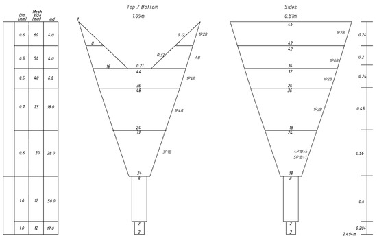 The two types of coastal stow net fishing gear were numerically modeled in three-dimensional space, and the simulations of stow nets were conducted. Then, the resistance force of each section, which is divided by the mesh size, was analyzed. These sections were determined according to the mesh size (Figure 5). The flow velocity conditions vary depending on where coastal stow net fishing is conducted (generally 0.7–1.2 m/s in Korea); the present study considered five flow velocities, ranging from 0.3 to 1.1 m/s at 0.2 m/s intervals. This range included flow velocities that were lower than expected for real fishing conditions in order to assess the spreading process for the gear. The depth of the fishing gear was set at 50 m, and calculations were conducted at 0.0001 s intervals.