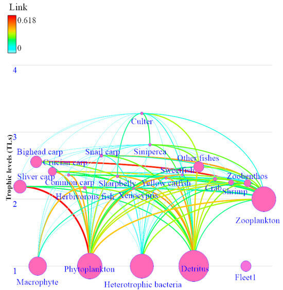 Structure of the Qianxiahu Reservoir’s food web. (The thickness of the curve is determined by the quantity of material flow. The size of the circles is logarithmically scaled to be proportional to the biomass, while TLs are clearly denoted on the left side of the diagram.)