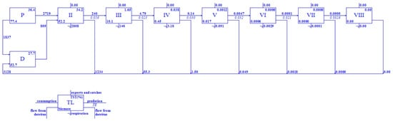 The summary statistics and characteristic parameter values presented in Table 2 provide insightful information on the Qianxiahu Reservoir ecosystem. Notably, the total detritus influx into the reservoir’s ecological fishery water system is substantial, reaching 3295.221 t/(km2·a), with a net production of 1597.638 t/(km2·a). Moreover, the ratio of total net primary productivity to the total respiratory volume, at 1.540072, indicates a robust balance between energy production and consumption within the ecosystem. Flow indices such as the ecosystem connectivity index (CI) and system omnivory index (SOI) play pivotal roles. Specifically, the CI and SOI values of 0.27 and 0.1963563, respectively, reveal an intricate interplay between the various components and TLs of the Qianxiahu Reservoir. Furthermore, the Finn’s cycling index (FCI), with a value of 11.35%, underscores the efficient cycling of matter and energy within the system.