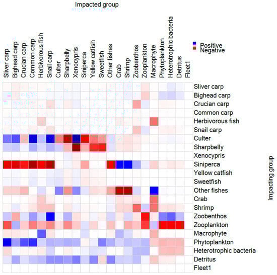 Mixed trophic impact (MTI) analysis of groups in the Qianxiahu Reservoir ecosystem. Blue and red colors in the graph indicate positive and negative correlation effects, respectively, and deeper color indicates stronger correlation effect.