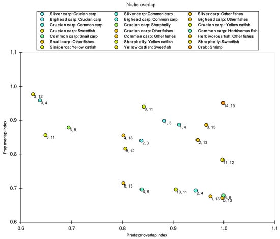 Analysis of niche overlap within the Qianxiahu Reservoir ecosystem. The numerical labels on the diagram correspond to the specific functional groups detailed in Table 1.