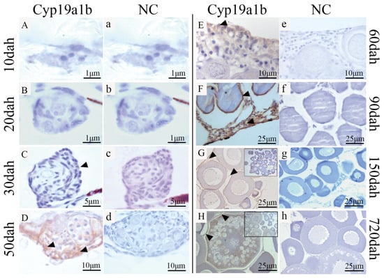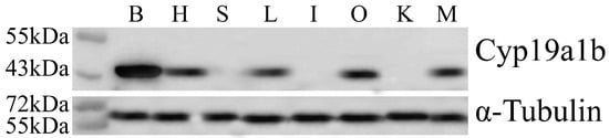 - Callard, G.V.; Tchoudakova, A.V.; Kishida, M.; Wood, E. Differential tissue distribution, developmental programming, estrogen regulation and promoter characteristics of cyp19 genes in teleost fish. J. Steroid Biochem. Mol. Biol. 2001, 79, 305–314. [Google Scholar] [CrossRef]