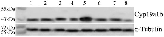 - Sawyer, S.J.; Gerstner, K.A.; Callard, G.V. Real-time PCR analysis of cytochrome P450 aromatase expression in zebrafish: Gene specific tissue distribution, sex differences, developmental programming, and estrogen regulation. Gen. Comp. Endocrinol. 2006, 147, 108–117. [Google Scholar] [CrossRef]