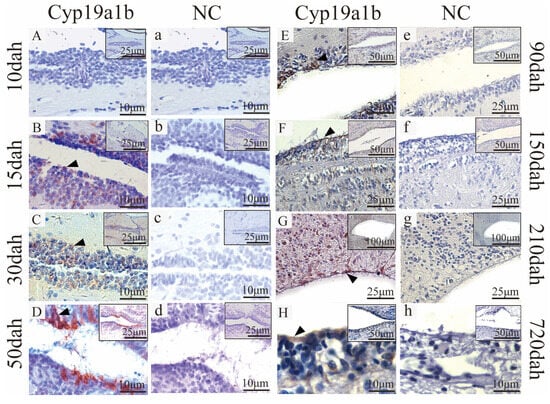 - Menuet, A.; Pellegrini, E.; Brion, F.; Gueguen, M.-M.; Anglade, I.; Pakdel, F.; Kah, O. Expression and estrogen-dependent regulation of the zebrafish brain aromatase gene. J. Comp. Neurol. 2005, 485, 304–320. [Google Scholar] [CrossRef]