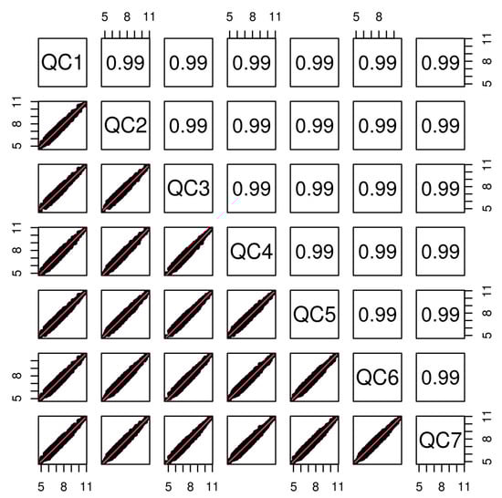 Horizontal and vertical coordinates in the figure represent QC samples. The points in each cell represent the ion peak (metabolite) extracted from QC samples, and the horizontal and vertical coordinates represent the pair value of the ion peak signal strength value. The value in the figure is the correlation coefficient value, and the coefficient greater than 0.9 is considered to be highly correlated.