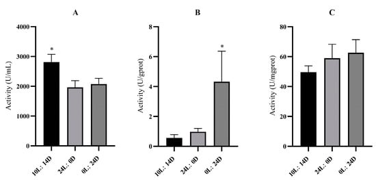 Figure 2 shows enzyme activity over time under different light−dark cycles. Specifically, trypsin activity was higher in the 10L:14D treatment, whereas no difference was observed between the 24L:0D and 0L:24D treatments. LPS activity was higher in the 0L:24D treatment group, whereas no difference was observed between the 24L:0D and 10L:14D treatments. AMS activity did not differ among the treatments. These findings indicate that varying photoperiods significantly affect the enzyme activities of these substances.