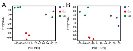 The results shown in Figure 3 reveal a clear separation between the 10L:14D, 24L:0D, and 0L:24D conditions in both positive and negative ion modes. This separation indicated that changes in the photoperiod significantly affected the metabolic status of P. sinensis.