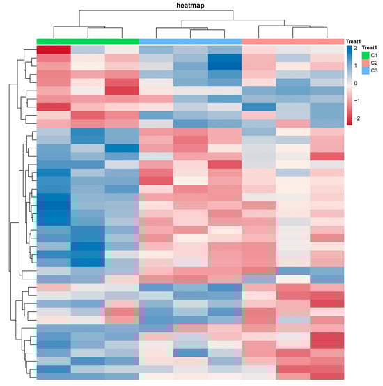 After stratified cluster analysis, we observed clear trends in metabolite clustering patterns between samples, and the results showed significant differences in metabolite content between the control and experimental groups. The treatment groups (24L:0D) and (0L:24D) were compared with the control group (10L:14D), and the clustering correlation was good (Figure 4).