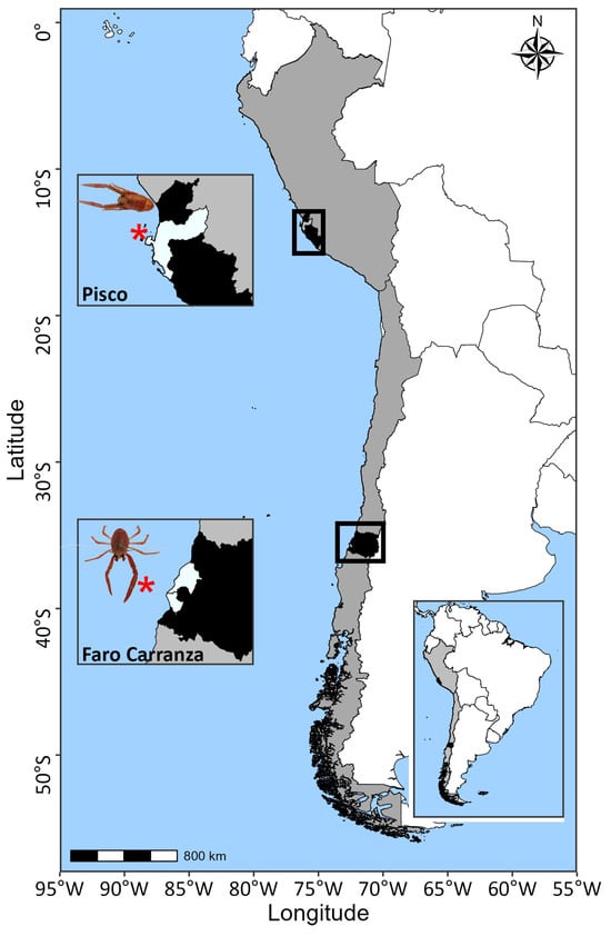 - Fagetti, E.; Campodonico, I. Larval Development of the Red Crab Pleuroncodes monodon (Decapoda Anomura: Galatheidae) under Laboratory Conditions. Mar. Biol. 1971, 8, 70–81. [Google Scholar] [CrossRef]