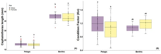 APA StyleQuispe-Machaca, M., Zilleruelo, M., Espinoza, P., Torres, G., & Urzúa, Á. (2024). Living Along Distribution Margins: Differences in the Body and Biochemistry of Red Squat Lobster Morphotypes (Grimothea monodon) from the Humboldt Current System. Fishes, 9(11), 445. https://doi.org/10.3390/fishes9110445