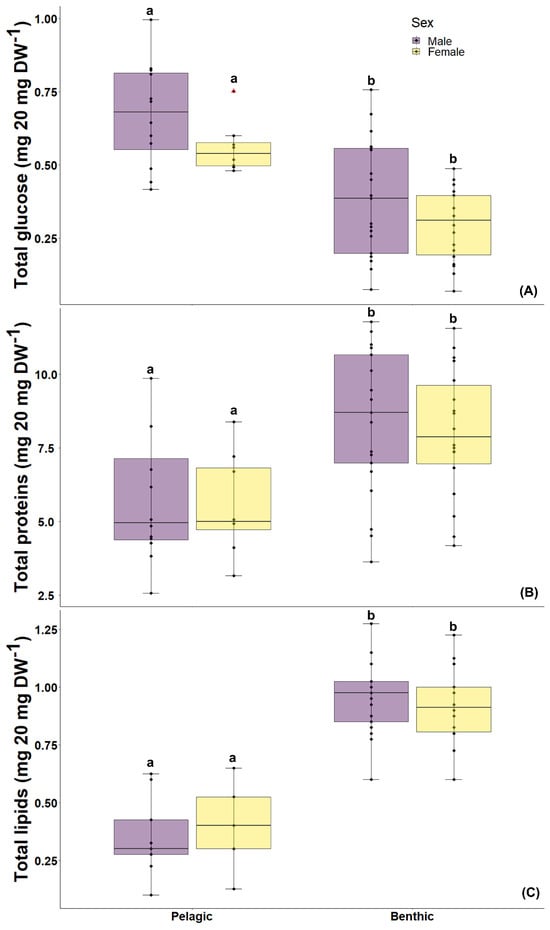 | Biochemical Condition (mg 20 mg Dry Weight−1) | Morphotype | Male | Female | ||