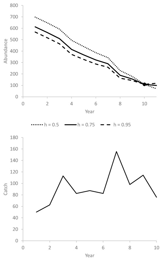 Estimates of historic abundance reconstructed with different steepness values of the stock–recruitment relationship from a given absolute abundance level in year 10 (top) under a given catch trajectory (bottom). Units in number of individuals. The simple population dynamics model is described in Appendix A and is fit to an absolute biomass estimate in year 10.