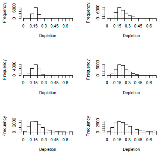 In the absence of a complete catch history, a short-term model that estimates the initial depletion level must be used. In this case, assumptions need to be made to determine the abundance in the absence of fishing. In particular, recruitment in the unexploited state needs to be determined, and its relationship with the current estimates of recruitment will rely on the stock–recruitment relationship, which is generally uncertain if not unknown. The stock–recruitment relationship is also an influential factor in determining reference points. Therefore, the assumptions about the stock–recruitment relationship can be important in determining depletion. Some limit reference points are based on the decline in recruitment due to fishing, which is a direct consequence of the stock–recruitment relationship (e.g., [8]). Reference points can also be highly dependent on the assumptions about natural mortality, which can be highly uncertain.