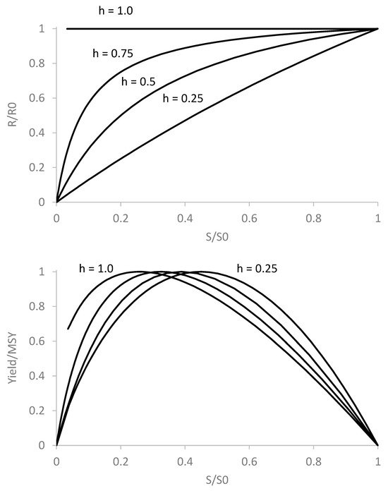 Recruitment as a fraction of virgin recruitment (top) and yield and a fraction of maximum sustainable yield (MSY, bottom) for different levels of depletion (spawning biomass divided by virgin spawning biomass, S/S0) and different steepness values of the stock–recruitment relationship. The latter represents the production function.