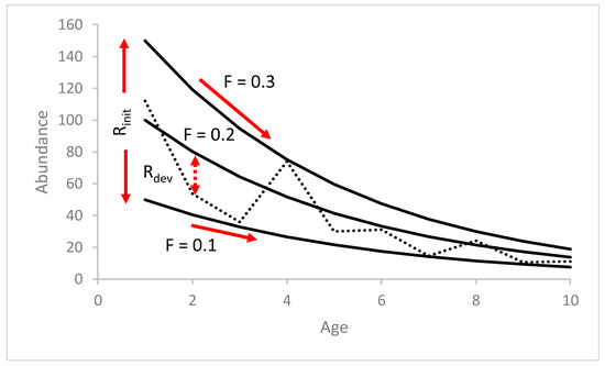 The age-structure of an exploited population at the start of the modeling time period in a short-term model is represented by Rinit that scales the recruitment and compensates for the stock–recruitment relationship and any other trends or regime shifts in recruitment that occurred before the start of the modeling time period, Finit that represents the historic fishing, and Rdev that represents individual variation in recruitment (and fishing mortality or other process variation) related to that cohort [27].