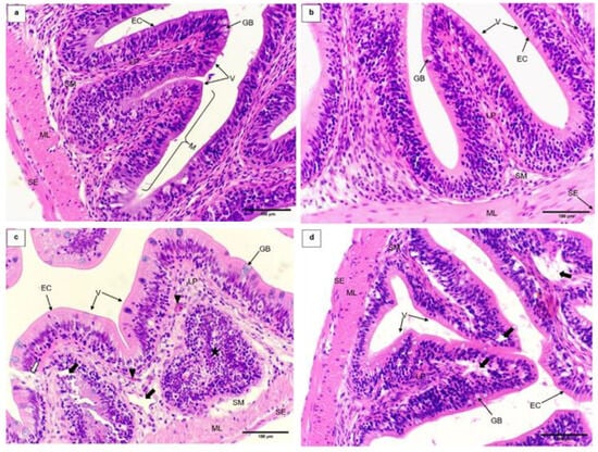 Intestine histopathology of Nile tilapia, stained with hematoxylin and eosin, where bar = 100 µm. EC = enterocyte; GB = Goblet cell; LP = lamina propria; M = mucosa; ML = muscle layer; SE = serosa; SM = submucosa; V = villi. (a) Control group showed normal structure of intestine, consisting of mucosa, submucosa, muscle layer, serosa, normal villi with normal enterocytes, goblet cells, and lamina propria. (b) MinazelPlus® group showed normal structure of intestine, consisting of mucosa, submucosa, muscle layer, serosa, normal villi with normal enterocytes, goblet cells, and lamina propria. (c) Mycotoxin group showed severe necrosis of enterocytes (white arrow) with lymphocytic infiltration, infiltration of mononuclear cells in lamina propria (star), edemas in lamina propria (black arrows), heterophil infiltration (arrowheads), hyperplasia of goblet cells, muscle layer degeneration, severe necrosis, degeneration, cell lysis in villi of intestine, and shorter intestinal villi. (d) Mycotoxin and MinazelPlus® group showed edemas in lamina propria (black arrows), goblet cells hyperplasia in some villi, moderate necrosis, degeneration, and cell lysis in villi of intestine.